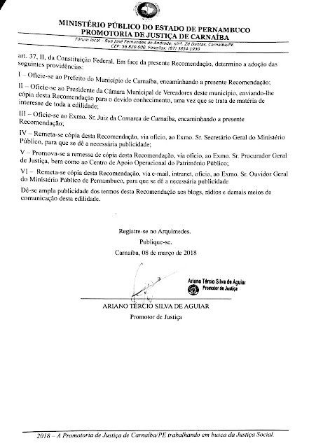 Em sua recomendação, o Promotor Dr. Ariano Tércio Silva de Aguiar considera que: