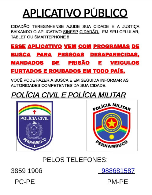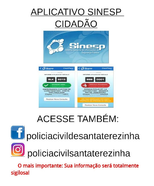 serão mantidas no absoluto sigilo. Também orientou que os cidadãos Santa-Terezinhenses baixem o aplicativo SINESP CIDADÃO, uma plataforma pública que todos podem fazer uso.