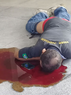 encontrado próximo ao banheiro do teatro com o rosto caído sobre uma
