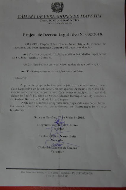 concede o título de Cidadão de Itapetim a João Henrique Campos, filho do