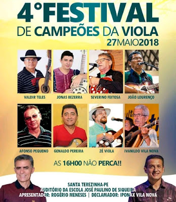 Dia 27 de maio Santa Terezinha voltará a ser palco de mais um grande encontro de poesia, com vários cantadores renomados que disputarão o 4º Festival de Campeões da Viola, dentre eles está o filho da terra Severino Feitosa. O auditório da Escola José Paulino de Siqueira ficará no comando do poeta Rogério Meneses, apresentador do evento, e como declamar Iponax Vila Nova. Violas de todos os cantos, admiradores de todos os lugares vão conferir a motivação dos poetas, cheios de talentos e reconhecidos nacionalmente pelos timbres de vozes e a beleza de suas poesias. Todos estão convidados!