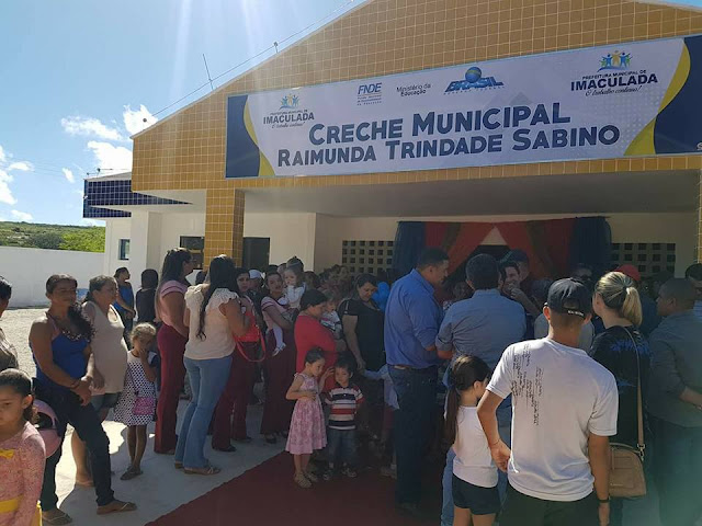 educação infantil. O gestor entregou com muita felicidade o novo prédio acompanhado no vice-prefeito Macarão, da 1ª Dama Roberta Trindade, da Secretária de Educação Virleide Aquilo, Secretário de Administração Jackson Caetano, mais secretários, vereadores, professores, alunos e pais. A creche foi conseguida numa parceria da prefeitura, com o FNDE, Ministério da Educação e PRONATEC, chegando em ótimo momento para a pró infância Imaculadense.