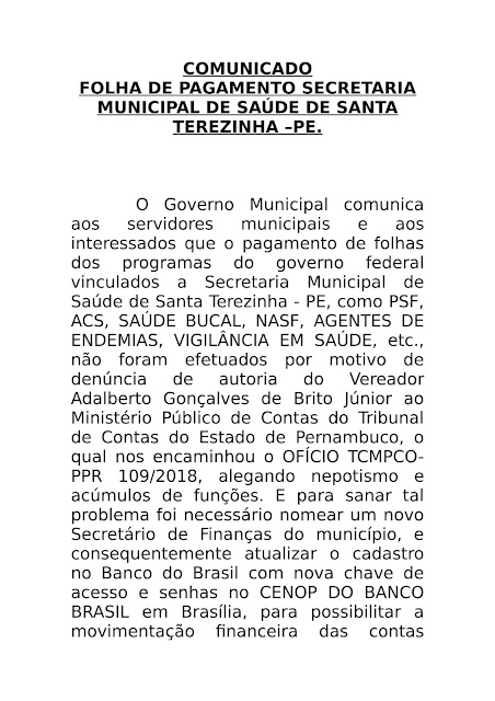 A prefeitura de Santa Terezinha se posicionou na manhã desta quarta-feira (1º) sobre uma denúncia feita ao Ministério Público de Contas do Tribunal de Contas do estado por um vereador da oposição de Santa Terezinha, o qual denunciou nepotismo e acúmulos de função. De acordo com o comunicado enviado ao blog, a denuncia afetará o pagamento dos servidores ligados a programas do governo federal, lotados na Secretaria de Saúde.