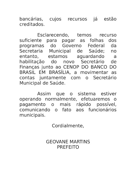 Segundo o comunicado, e por causa da denúncia, foi necessário nomear um novo Secretário de Finanças e atualizar o cadastro junto ao Banco do Brasil, com chave de acesso e senhas que são liberadas pela sede da instituição em Brasília, e enquanto o banco não libera o acesso, a movimentação financeira das contas para pagamento dos servidores da saúde está prejudicada, mesmo tendo recurso suficiente para pagar a folha.