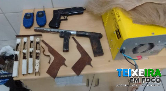 espingarda calibre 12 e uma carabina calibre .38”, além de moldes,