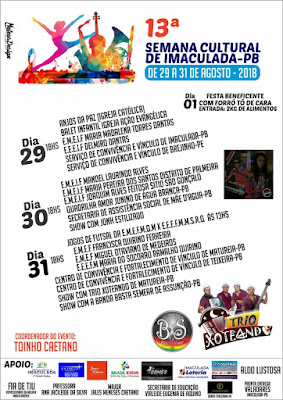 Acontece no final deste mês a 13ª Semana Cultural em Imaculada-PB, onde a um engajamento de várias áreas, sobretudo da educação para o resgate da cultura popular nordestina. Dia 29 será a abertura. Nos dias 30 e 31 de agosto teremos shows. Durante as festividades várias atividades e apresentações serão apresentadas por alunos Imaculandeses e de outras cidades. No dia 1º de setembro ainda vai ter uma festa beneficente com Forró Tô de Cara. Para entrar basta levar dois quilos de alimentos.