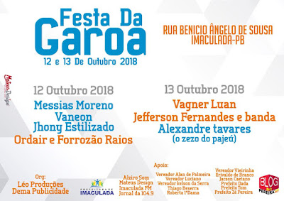 Mês que vem Imaculada promove a Festa da Garoa, edição 2018. Com o apoio do prefeito Dada a festa acontece em dois dias, 12 e 13 de outubro em um novo local, na rua Benício Ângelo de Sousa (rua de Pedro Som) e trás atrações musicais que movimentam a cidade, entre elas Jhony Estilizado e Alexandre Tavares, o Zezo do Pajeú. De acordo com a produção do evento, era comum cair uma garoinha no mês de outubro na cidade, o que originou o nome da festa que ano, a ano, atrai grande público que se diverte gratuitamente.