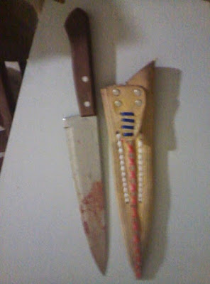 O imputado foi até a sua residência, que é em frente ao local da ocorrência e pegou a faca, voltando ao local desferindo um golpe contra a vítima, acertando no braço esquerdo.