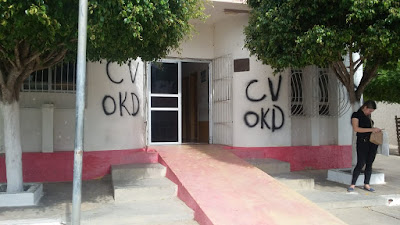 pichação com as iniciais do Comando Vermelho (C.V) e O.K.D., abreviação