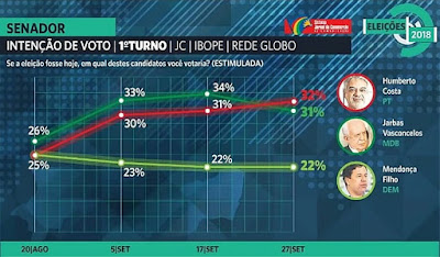 O senador Humberto Costa (PT), candidato à reeleição, oscilou de 31% para 32% e ficou numericamente à frente do deputado federal Jarbas Vasconcelos (MDB) na pesquisa realizada pelo Ibope, em parceria com o Jornal do Commercio e a TV Globo, divulgada nesta quinta-feira (27). Jarbas tinha 34% e agora tem 31%, uma queda dentro da margem de erro, que é de três pontos percentuais.