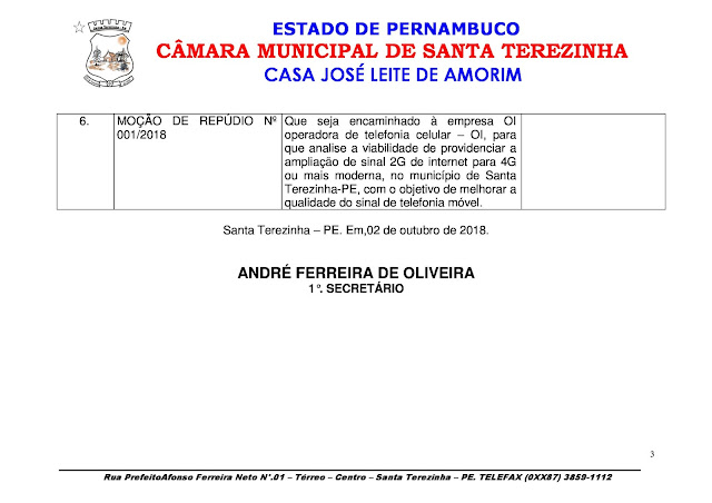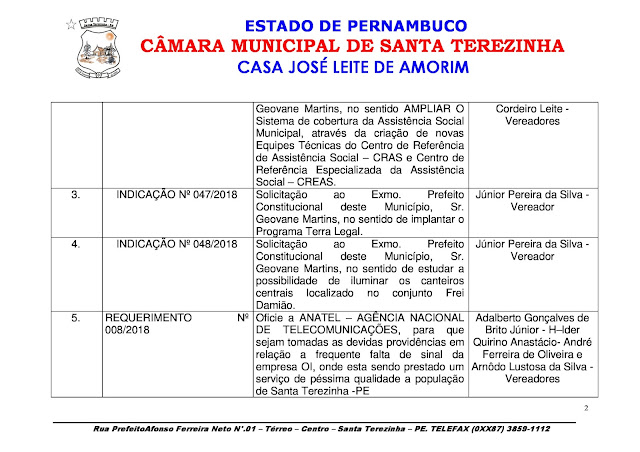 As proposições da reunião ordinária da Câmara de Vereadores de Santa Terezinha, trazem hoje (03) doação de um terreno da prefeitura; envio de um Projeto de