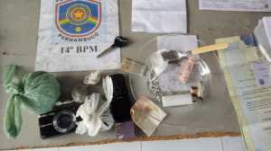 apreendida uma sacola com cinco gramas de cocaína, maconha, além de um