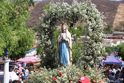 recepcionadas no portal da entrada da cidade de onde seguem em procissão