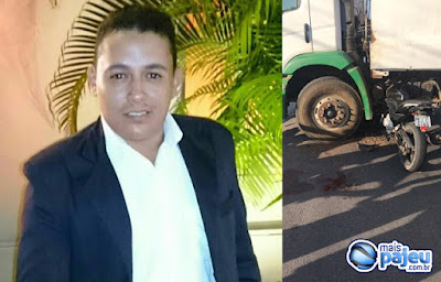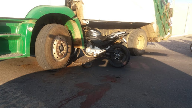 velocidade, vindo a colidir na lateral do caminhão, ficando a moto presa