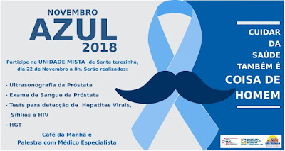 A Unidade Mista de Saúde de Santa Terezinha dando continuidade a Campanha Novembro Azul, estará oferecendo nesta quinta-feira (22) a partir das 8hrs da manhã para homens com 40 anos ou mais, ultrassonografias da próstata, exame de sangue da próstata, testes para detecção de hepatites virais, HIV, Sífilis e teste de glicemia capilar. De acordo com a diretora da unidade Tereza Martins o atendimento será por ordem de chegada. Os homens receberam café da manhã e ainda terão palestra com o médico Alexandre Simões.