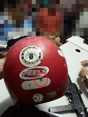 vítima e que transfixou seu capacete por trás, saindo pelo lado direito,