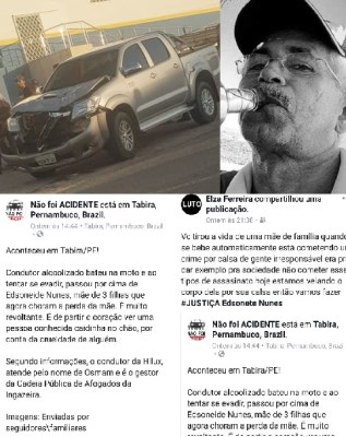 | Imagens do acusado e cobrança de punição correm as redes sociais. “Para tentar se evadir, passou por cima de Edsoneide, diz link do “Não foi acidente”. |