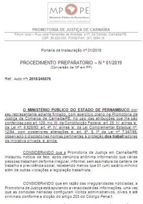 Carnaíba. O Ministério do Trabalho e Emprego e o Ministério Público do