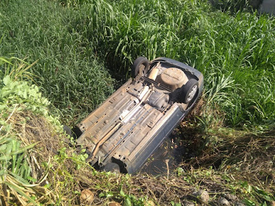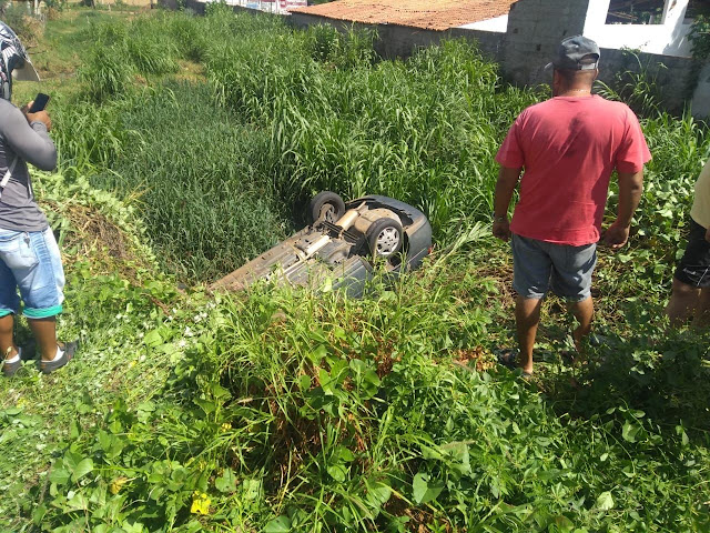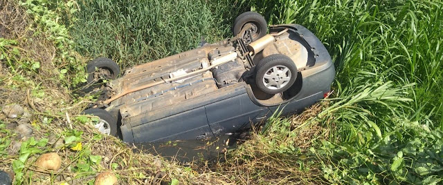O carro ficou capotado com os quatro pneus para cima dentro de um capinzal ali existente.