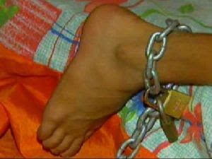 correntes que prendiam da região dos pés aos quadris.