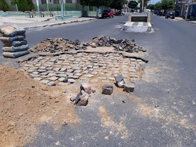 Por aqui é o seguinte! Quando não chove reclamam e quando chove reclamam também, geralmente do calçamento ruim e com toda a razão, um problema que vem se arrastando a muito tempo. A novidade este ano é que parte da rua principal asfaltada pela prefeitura no ano passado já começa a apresentar defeitos, apresentando rachaduras e afundando próximo a praça Amaro Paes de Lira, em um lugar que passa mais água durante as chuvas, que escorrem para o Açude Virgulino.