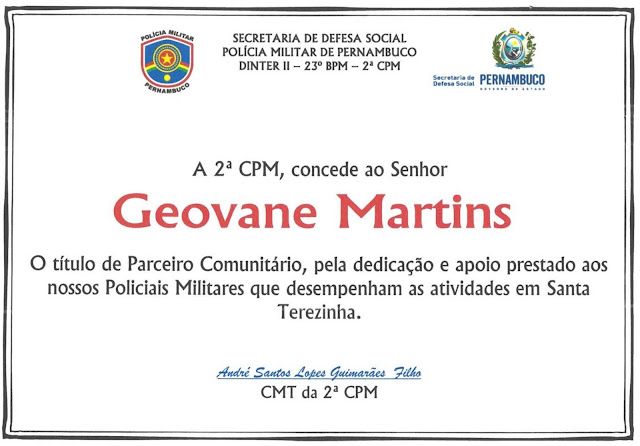 A Polícia Militar do estado, através do 23ª BPM, 2ª CPM concedeu ao atual prefeito de Santa Terezinha Vanim de Danda o Título de ‘Parceiro Comunitário’ pelo apoio que vem dando aos policiais militares que trabalham na área do município. O prefeito havia solicitado a Pulo Câmara, quando este esteve por aqui, a substituição da viatura usada pelos militares em Santa Terezinha por uma nova, também a designação de um delegado e aumento do efetivo da polícia judiciária, pleitos atendidos pelo chefe do estado.