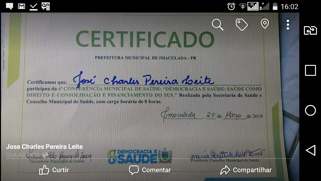 “Quero agradecer a Deus por mais um dia que me concedeu para ter a felicidade de participar da 4ª Conferência Municipal de Saúde. Quero agradecer ao secretário de saúde Franco Aldo Beserra de Sousa (Franco), por ter me convidado. O tema é muito importante para o nosso município; e o que mais defendo é a saúde. Foi formado três equipes o qual a minha equipe foi a cor azul e criamos varias propostas. Das propostas indicadas eu Charles Leite, indiquei a oitava (8) aquisição de aparelhos de exames tipo, Ultrassonografia, ecocardiograma, mamografia, raio-x e aparelho tomógrafo”.
