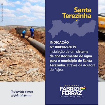 O deputado estadual Fabrízio Ferraz atendeu a uma solicitação feita por um grupo político de Santa Terezinha, liderado pelo suplente de vereador Charles Lustosa, Dodô do Tigre e Antonio César a cerca da conclusão do Ramal Emergencial da Adutora do Pajeú, que ainda aguarda o funcionamento.