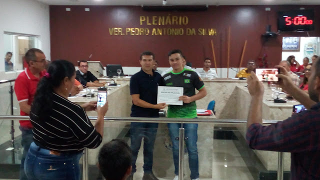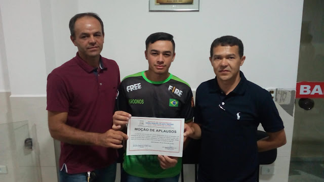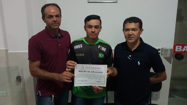 O jovem Santa-Terezinhense Ariano Ferreira finalmente recebeu a justa Moção de Aplausos das mãos do vereador Lindomar Leite pelas conquistas esportivas no Free Fire, feitos que ficaram um pouco de lado pelo clima político na Câmara.