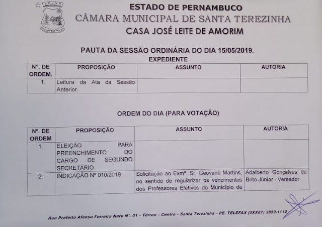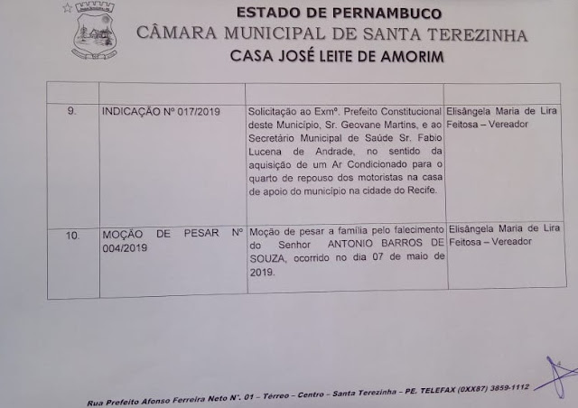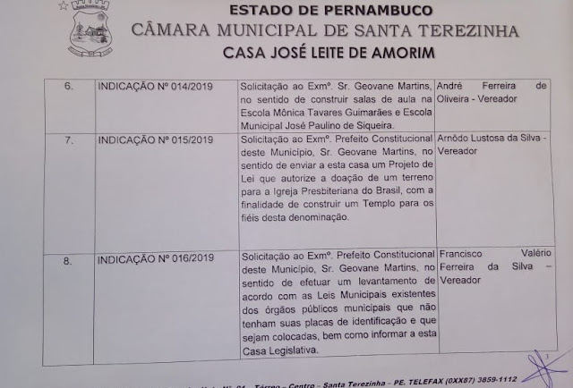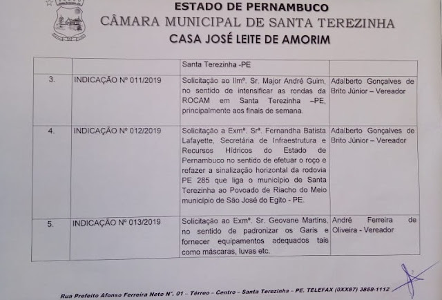Regularização dos vencimentos dos professores efetivos do município. Pedido ao 23º BPM que intensifique rondas com a ROCAM na cidade. Solicitação do roço do mato na PE 285 até Riacho do Meio. Fardamento para os garis e equipamentos.