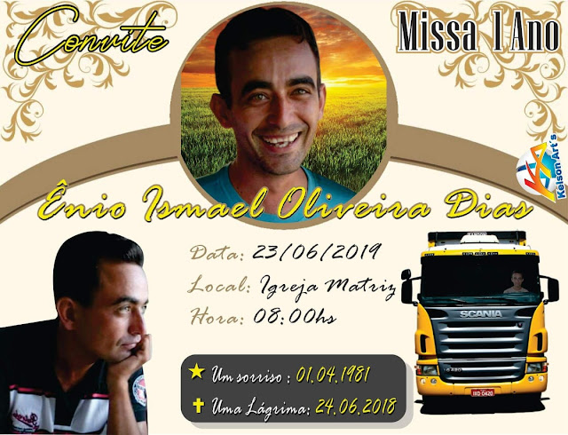 A família do jovem caminhoneiro Ênio Ismael ainda consternados com sua partida precose para junto do pai eterno, vem através desta convidar parentes amigos e o povo em geral para assistir a missa de um ano de saudades. Nesse próximo domingo, dia 23 de junho, às 8hrs da manhã na Matriz de Santa Terezinha.