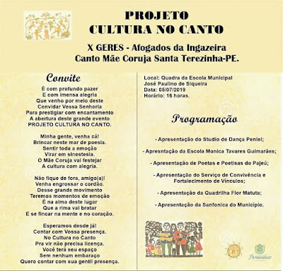 O Mãe Coruja de Santa Terezinha está realizando na tarde desta sexta-feira (5) a abertura do Projeto Cultura no Canto. O projeto tem o objetivo de resgatar a cultura, contaçao de historias, declamação de poesia, danças e musicas.  O evento acontecerá na quadra da Escola José Paulino de Siqueira a partir das 4hrs da tarde.