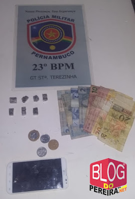 O policiamento procedeu a abordagem fazendo uma busca pessoal ao suspeito onde foi encontrado no bolso de seu blusão (casaco) a quantidade de sete (7) Big-Big’s de Cannabis Sativa (maconha), pesando aproximadamente 48,5 gramas, além da quantia de R$ 80,25 (oitenta reais e 25 centavos), também um aparelho celular marca LG.