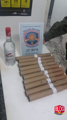 A GT atendeu a ocorrência de perturbação da paz, constatando a veracidade nas informações repassadas e diante do fato, o policiamento apreendeu 10 (dez) fogos de artifícios e 01 (um) litro de vodka que estavam de posse dos dois menores.