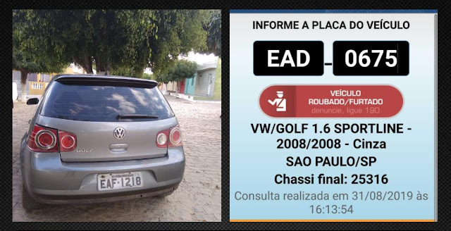 Após levantamento do NIS/BEPI sobre um possível veículo roubado que estaria no bairro Novo Virgulino a equipe do GATI seguiu até a cidade de Santa Terezinha na tarde desse sábado (31/08) para fazer diligências no intuito de recuperar o veículo Volkswagen Golf placa EAF-1218, pois segundo informes, ele seria roubado/clonado.