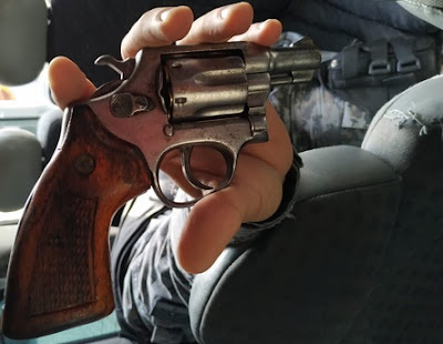 Foi dada voz de parada aos imputados, instante em que eles desembarcaram e começaram a realizar disparos de arma de fogo contra o efetivo, tendo a guarnição reagido, no intuito de fazer cessar a injusta agressão. Os imputados renderam-se, sendo então realizada a abordagem. No momento da ação um indivíduo não identificado empreendeu fuga, não sendo localizado. Próximo a imputada [J. V. L. V.] de 22 anos foi localizado 01 revólver Cal.38, marca taurus, nº 3607.