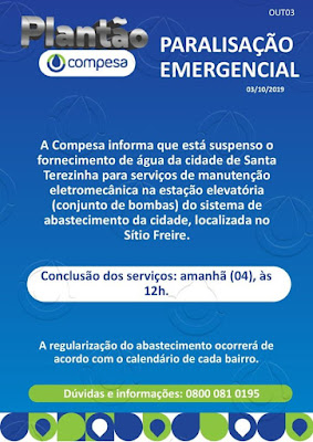 localizado no Sitio Freire. “Por tal motivo, o abastecimento está suspenso na cidade de Santa Terezinha. A COMPESA agradece a atenção e nos colocamos à disposição para