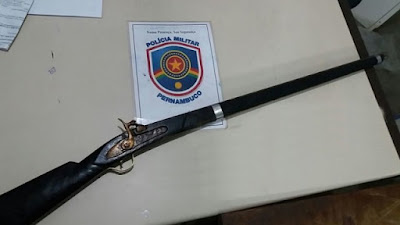 Após receber denúncia anônima na manhã desse domingo (13) a equipe da ROCAM com o apoio da GT se dirigiu até a zona rural do município no intuito de verificar uma denúncia de posse de arma de fogo. Chegando lá localizaram a residência do agricultor [J. J. da S.] de 49 anos que fica ao lado de um terreno aberto, onde na ocasião o efetivo fez uma varredura no local, e ao olharem para o muro da casa do imputado, que é aberto, encontraram ao lado do lavador de roupas uma ESPINGARDA TIPO SOCA-SOCA, ANTIOCARGA, CORONHA EM MADEIRA DA COR PRETA, feita artesanalmente e em perfeito funcionamento o dispositivo de disparo.
