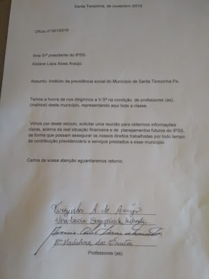 Uma comissão de professores inativos de Santa Terezinha representando toda a classe convocou uma reunião com o Instituto de Previdência Social (IPSS) do município para obter informações da real situação financeira e de planejamentos futuros do instituto. De acordo com ofício enviado ao IPSS o objetivo da reunião é assegurar os direitos trabalhistas pelo tempo de contribuição previdenciário e serviços prestados ao município. A reunião será das 9h30min até o meio dia desta próxima sexta-feira, dia 8 de novembro na Câmara de Vereadores.