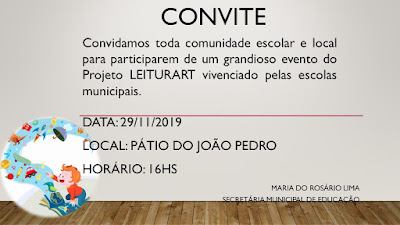 Na tarde desta sexta-feira (29) o Projeto LEITURART será apresentado em evento no pátio do João Pedro de Santa Terezinha. A comunidade escolar local está convidada a participar desse projeto engajado pelas escolas do município, despertando nos educandos o prazer de ler e desenvolver a arte bela e atraente.