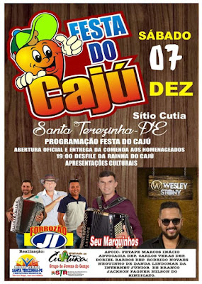 Neste sábado (7) a comunidade rural de Santa Terezinha juntamente com a prefeitura promovem a Festa do Caju no sítio Cutia. Este ano teremos o desfile da rainha do caju, apresentações culturais e shows com Cícero Tobias e Forrozão JI, Aquela Mina, Wesley Stone e o forró de qualidade de Seu Marquinhos. A festa do Caju faz parte do calendário de eventos tradicionais de Santa Terezinha, nessa época do ano em que os cajueiros estão safrejando.