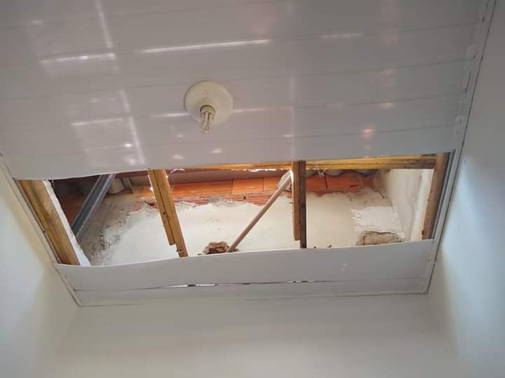 adentrou pelo teto, onde quebrou o PVC, após ter destelhado o prédio e