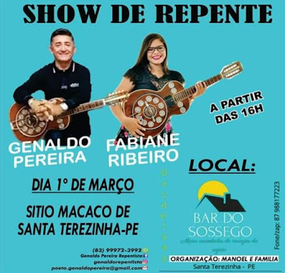 Neste próximo domingo, dia 1º de março Santa Terezinha recebe no Bar do Sossego o poeta Genaldo Pereira e a poetisa Fabiane Ribeiro para uma tarde de cantoria a partir das 4 horas da tarde. Manoel de Luiz de Dim e família estão convidando e aguardado todos os amantes da boa cantoria para participar.