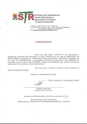 O Sindicato dos Trabalhadores Rurais de Santa Terezinha cancelou na manhã desta quarta-feira (18.03) a Assembleia que estava com data definida para o próximo dia 30 de março. De acordo com o comunicado o motivo é pelo Coronavírus e que a decisão também afetará o horário de atendimento da edilidade, que a partir do dia 23 próximo terá expediente para o público das 8hrs da manhã até o meio dia por tempo indeterminado.