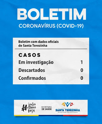 Santa Terezinha continua com um caso suspeito do COVID-19. A idosa com caso investigado tem 90 anos e segue internada em observação, passando por exames e aguardando a conclusão de topo o protocolo para se chegar ao resultado final do caso. Seus filhos também estão sendo acompanhados. O Comitê formado para lidar com a crise do Coronavírus em Santa Terezinha está monitorando a situação com as equipes em saúde e logo que o resultado final chegar estará divulgando.