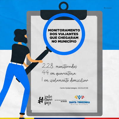 As equipes em saúde de Santa Terezinha continuam o monitoramento das pessoas que chegam ao municípios de outras cidades, sobretudo do sul do país, onde há maior relevância de contágio pelo Covid-19. Até esta sexta-feira, 1º de maio já são 228 pessoas monitoradas pelas vigilâncias sanitária e epidemiológica. No momento, são mais quarenta e quatro (44) pessoas que estão em quarentena e mais uma (1) que está em isolamento domiciliar.