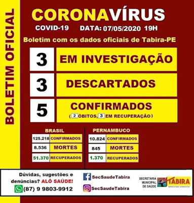 Com isso, Tabira chega a cinco casos confirmados, três casos confirmados e três casos em investigação. Dos casos confirmados, houve dois óbitos e três em recuperação.