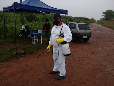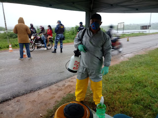 Os agentes de endemias e controle de vetores usam nas bombas de dedetização uma solução com água sanitária que ajuda no combate ao Coronavírus, além disso, as pessoas que passam pelas barreiras continuam tendo suas temperaturas aferidas.
