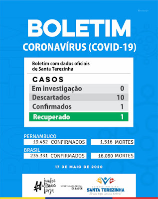 O 1º caso confirmado, também é o 1º caso de recuperação (cura) do vírus em Santa Terezinha, devido ao empenho da pessoa, que seguiu todo o protocolo exigido pelas autoridades em saúde e todo o trabalho das pessoas que estão na linha de frente no combate ao Covid-19.