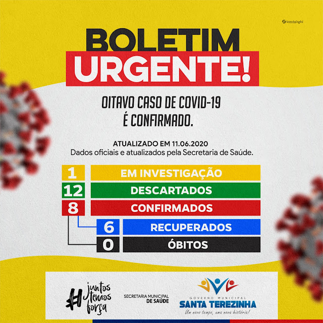 A cidade chega ao 8º caso confirmado de Covid-19, são seis (6) recuperações e 12 casos descartados. Nenhum óbito.